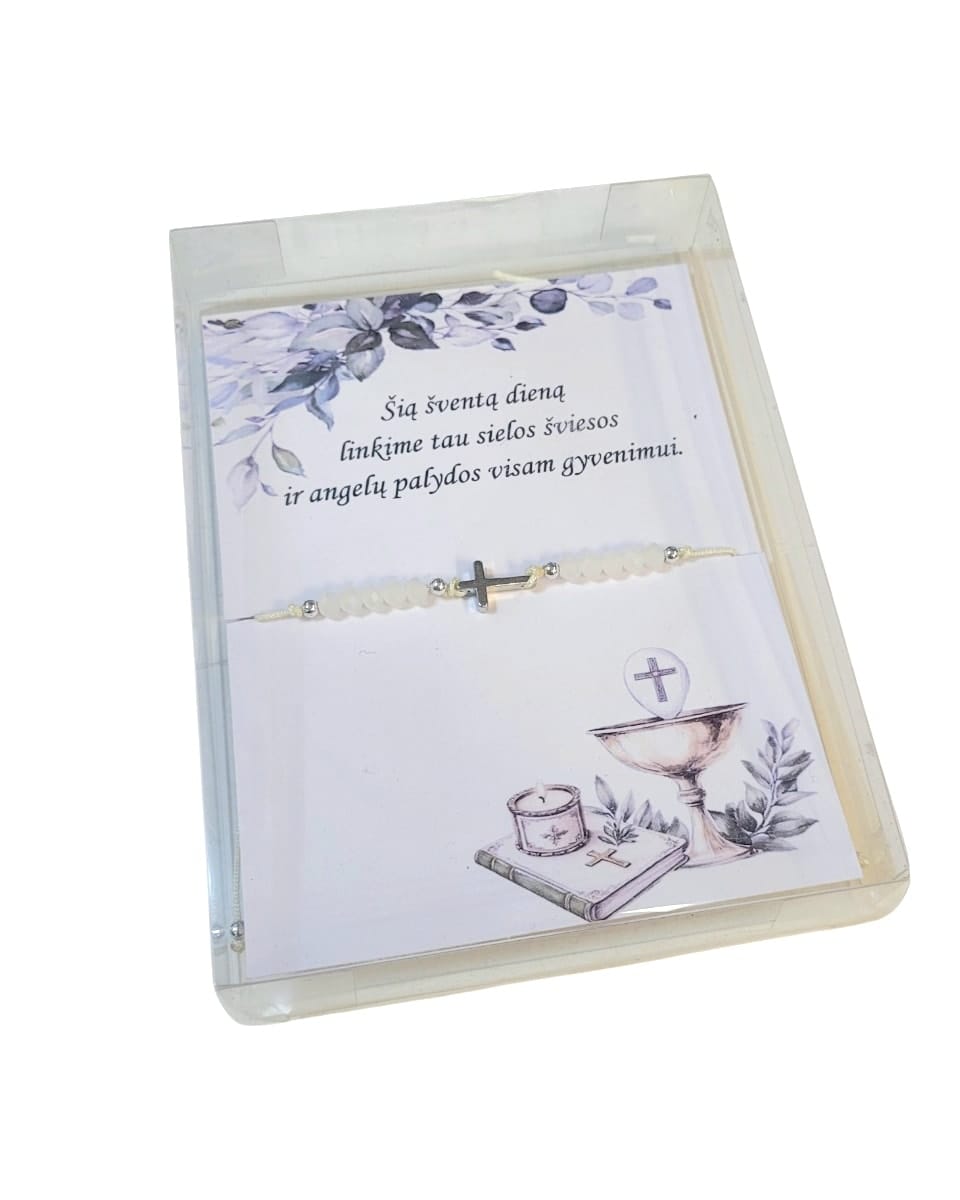 Puiki dovana Pirmosios komunijos, krikštynų ar sutvirtinimo sakramento proga , apyrankė su krikščionišku palinkėjimu dėžutėje.
