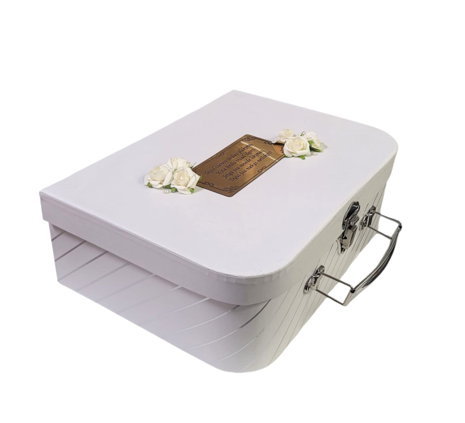 Dėžutė-lagaminėlis užsegamas. Skirtas dovanoti pinigėlius, loterijos bilietus ar šiaip dovanėlę.Dydis 25x19x9 cm