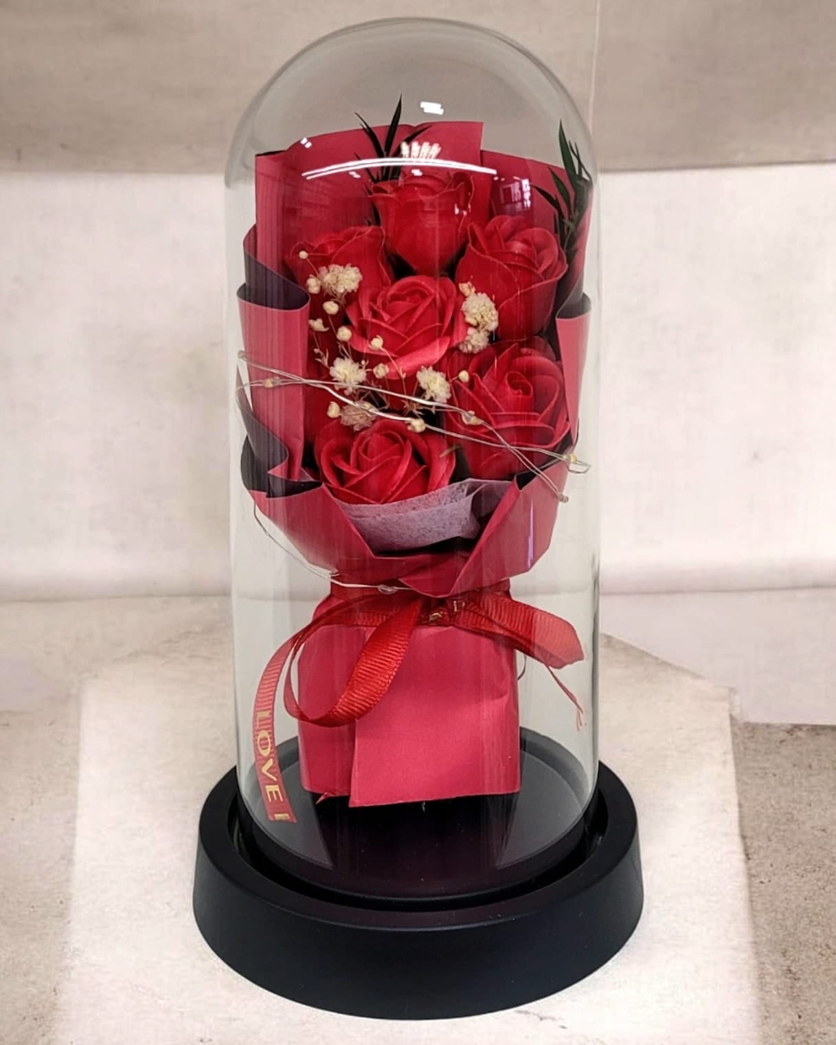 Gėlių puokštė stikliniame kupole su apšvietimu