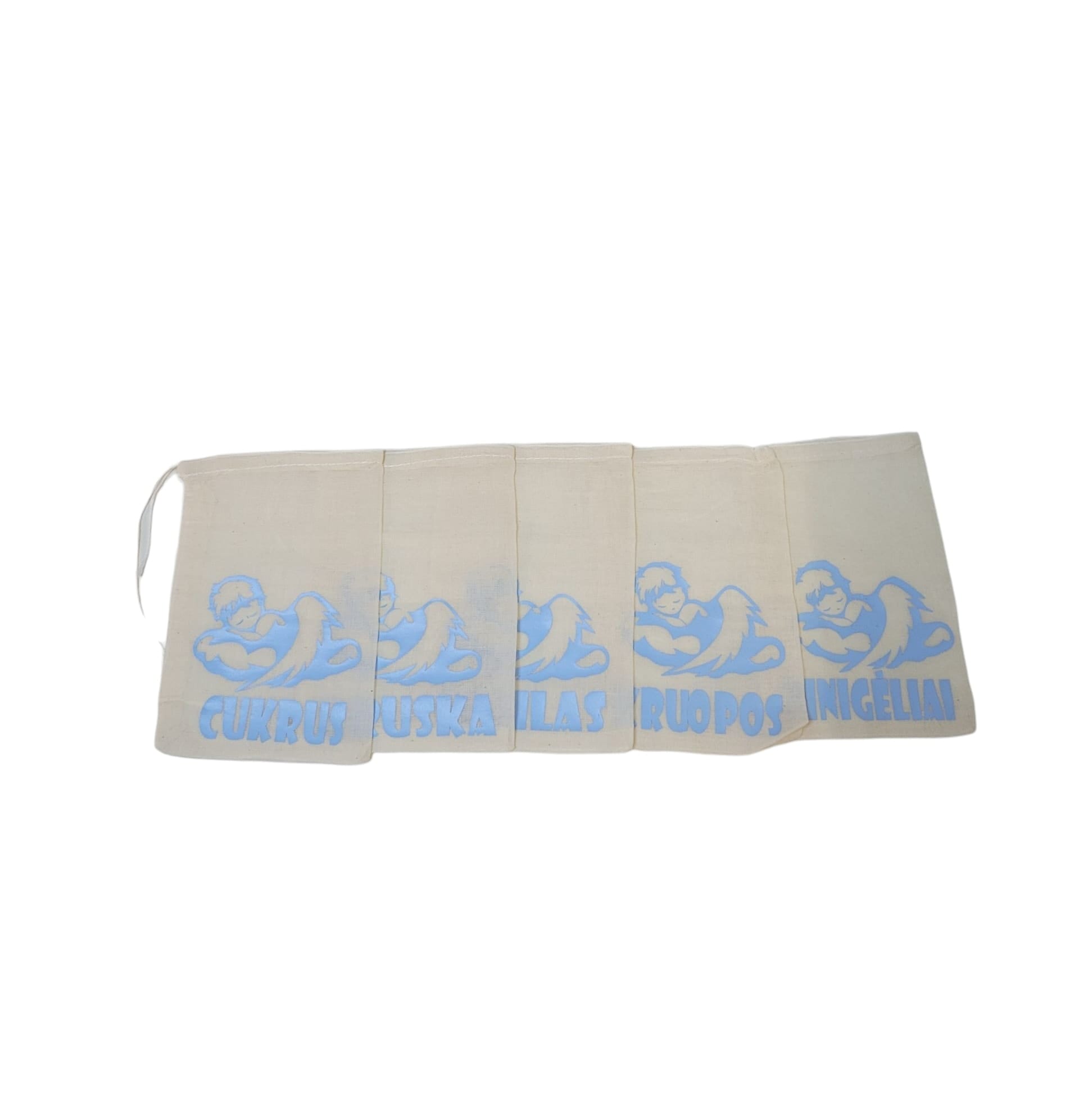Krikštynų palinkėjimų maišeliai, skirti sudėti įvairias gėrybes į krikštadėžę su palinkėjimais. Parduodamas visas rinkinys kurį sudaro 5 maišeliai su užrišimais. Maišelių išaiškinimas: Kruopos – sočiam gyvenimui, pinigėliai – turtingam gyvenimui, druska – kad priduotų gyvenimui skonio, cukrus – saldžiam gyvenimui, muilas – švariam gyvenimui.