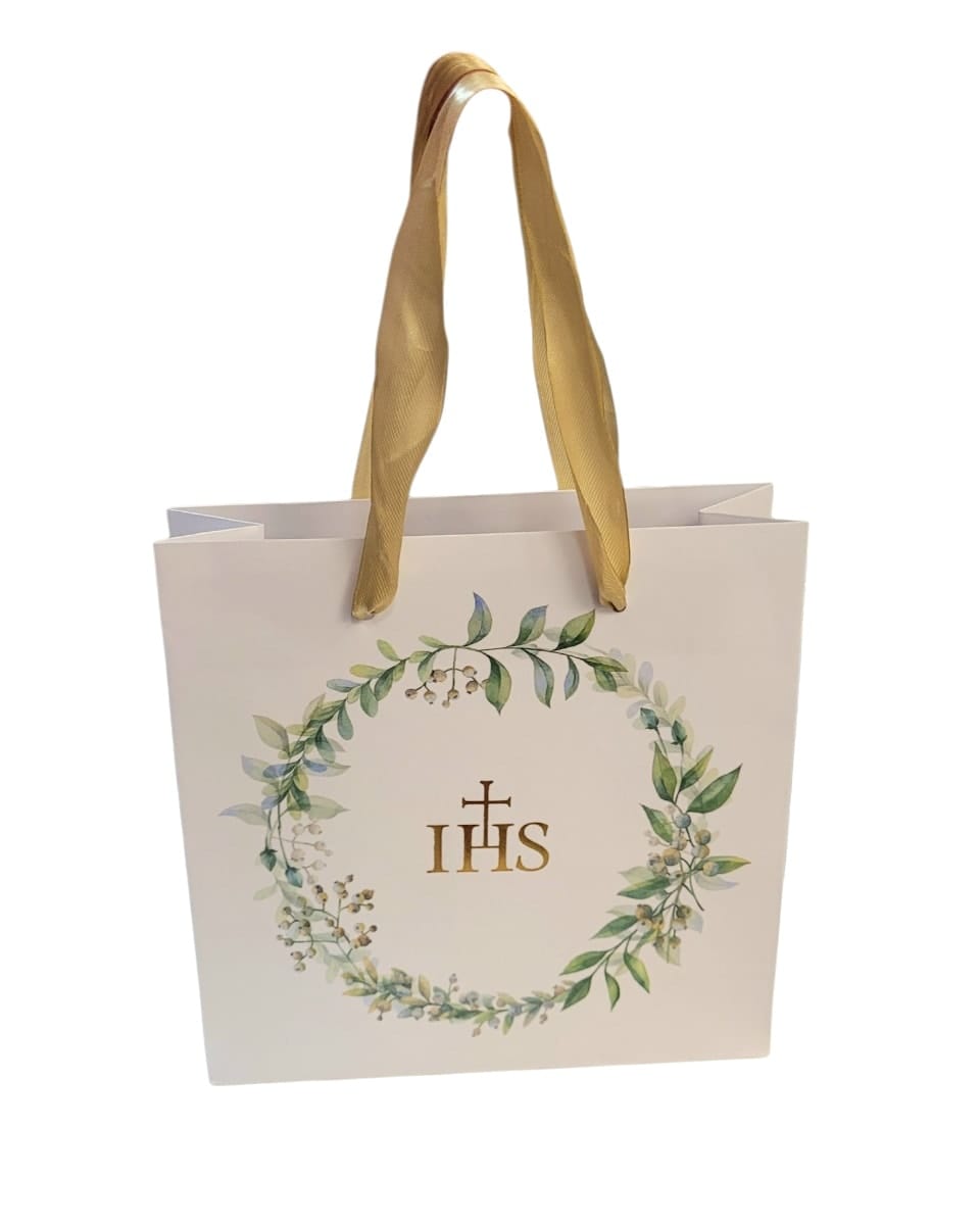 Maišelis popierinis, dydis 17x17x6 cm. Skirtas dovanėlei Krikštynų, sutvirtinimo sakramento ar pirmosios komunijos proga.