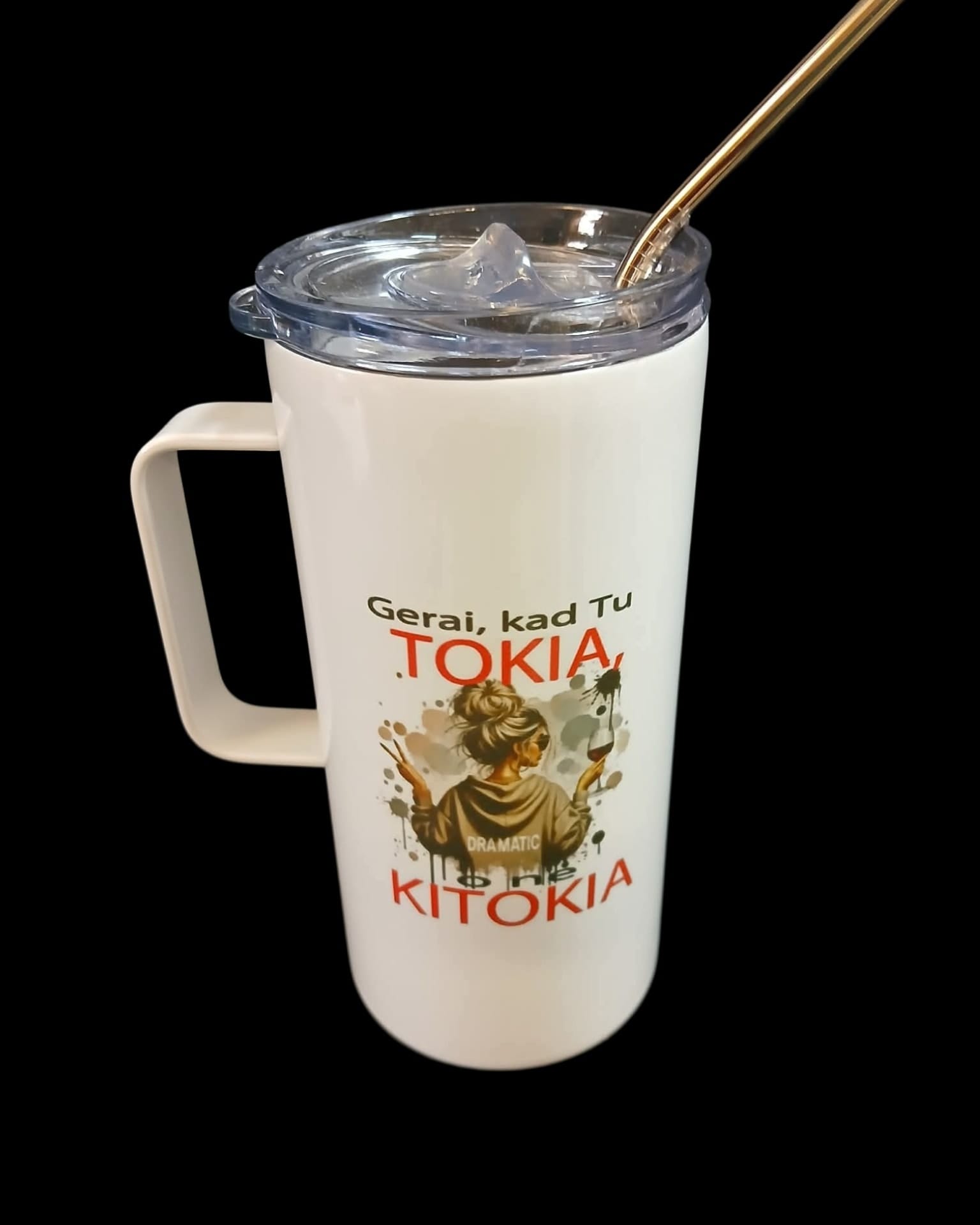 Metalinis puodelis-gertuvė su metaliniu šiaudeliu „Gerai, kad tu tokia, o ne kitokia”