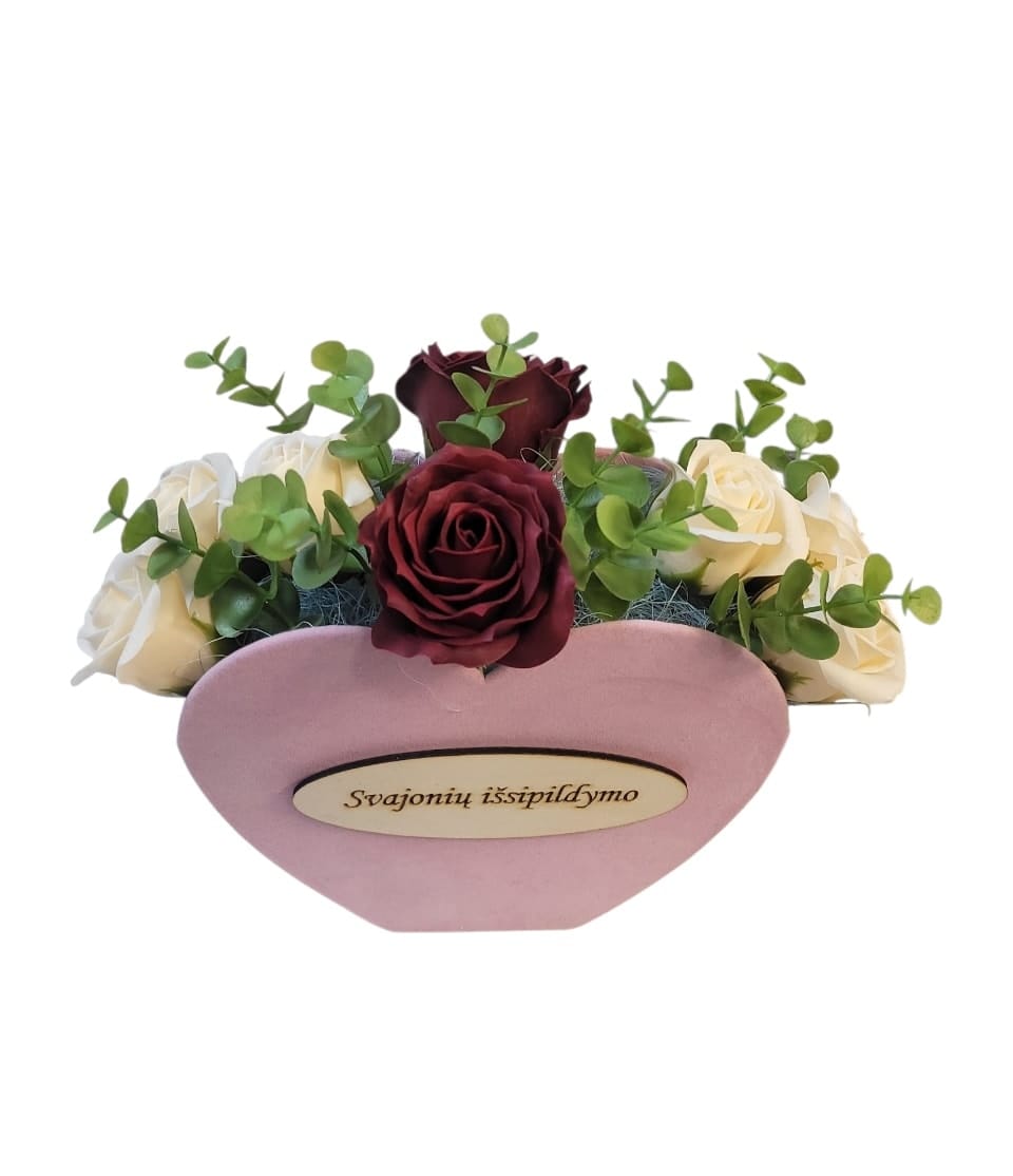 Muilo gėlių puokštė barchatinėje, širdelės formos dėžutėje „Svajonių išsipildymo”