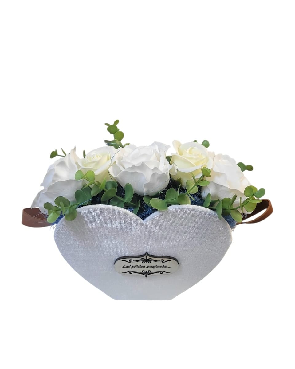 Muilo rožių puokštė barchatinėje , širdelės formos dėžutėje „Lai pildosi svajonės”