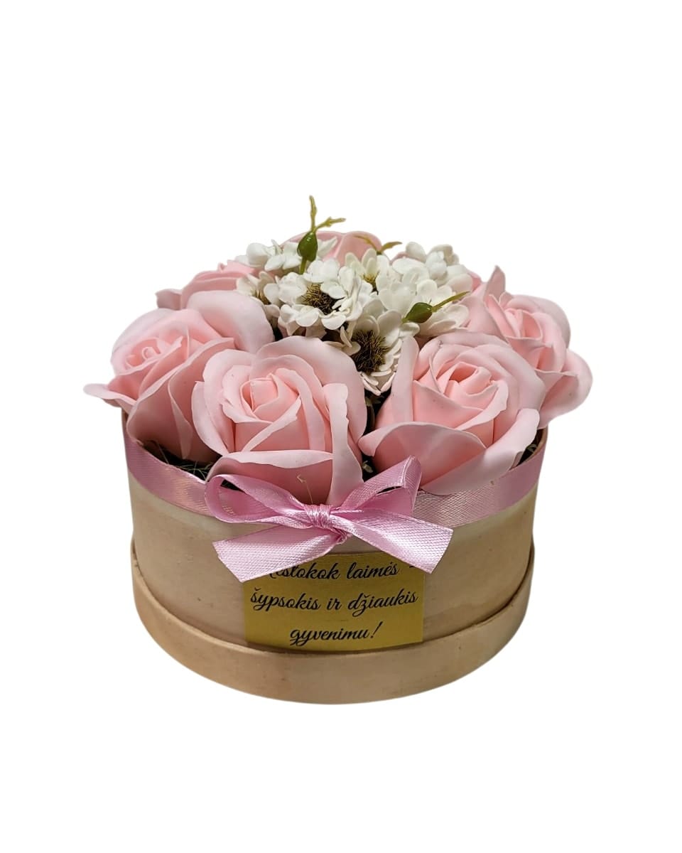 Muilo rožių puokštė medinėje dėžutėje „Nestokok laimės – šypsokis ir džiaukis gyvenimu”