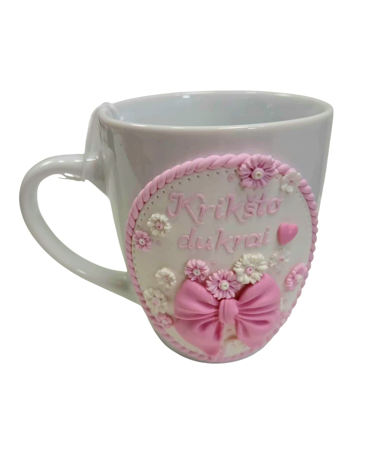 Puodelis dekoruotas modelinu „Krikšto dukrai”