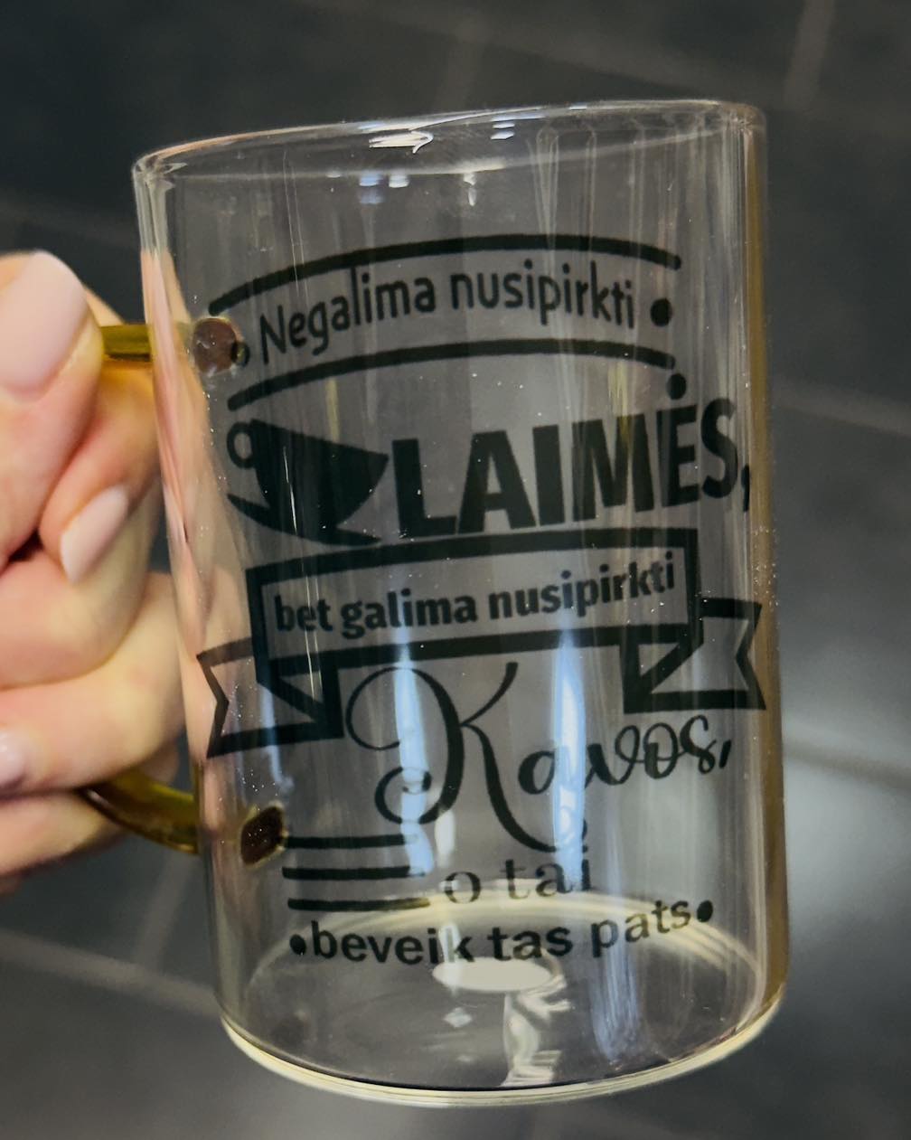 Puodelis stiklinis „Negalima nusipirkti laimės, bet galima nusipirkti kavos”