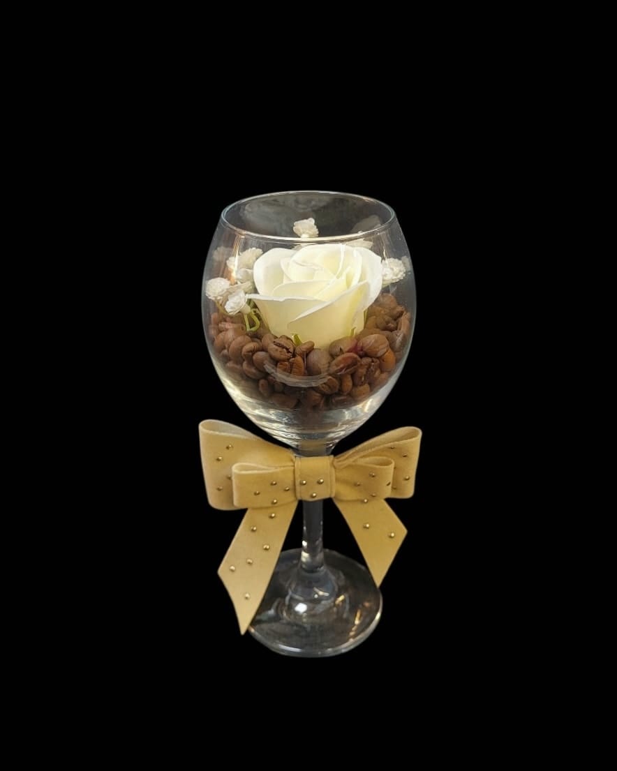 Puokštė stiklinėje taurėje su kava ir muilo rože