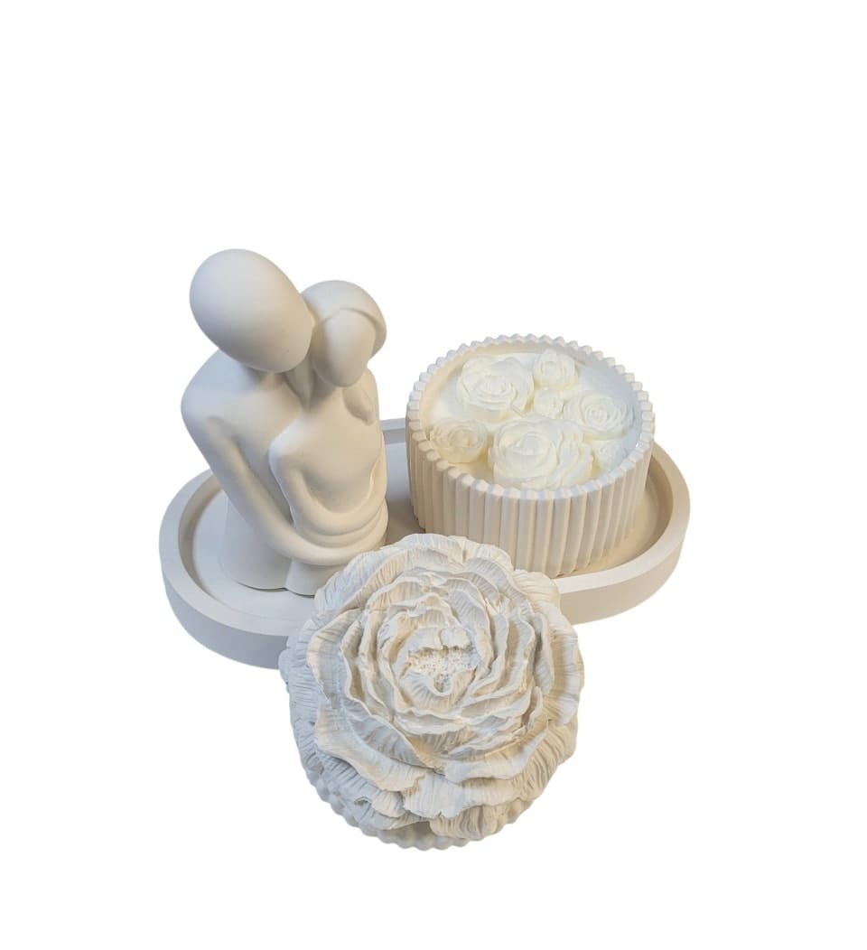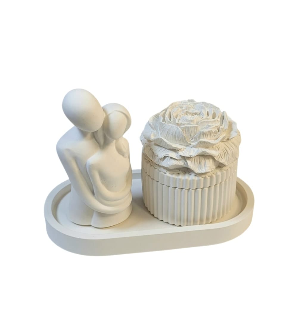 Rinkinukas „Sojų vaško žvakė indelyje, padėkliukas ir statulėlė”