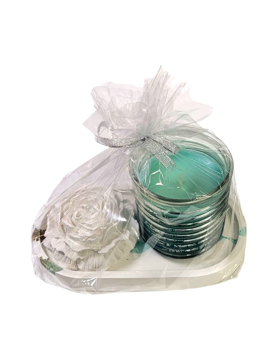 Rinkinukas „Žvakė stikliniame indelyje, padėkliukas ir gipso gėlė”