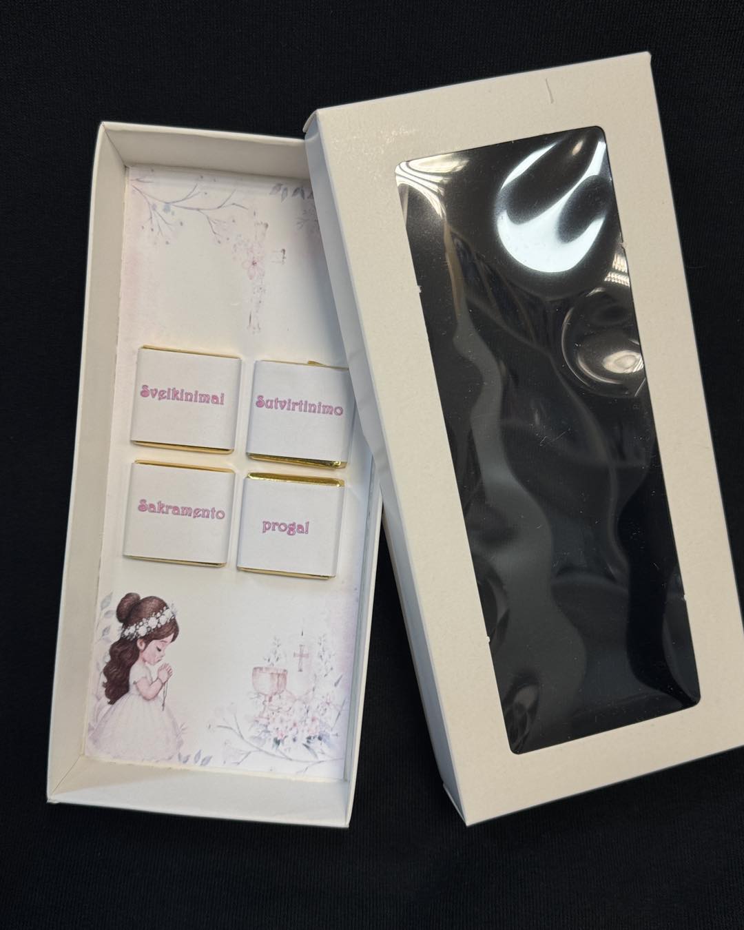 Dėžutė su 4 vnt šokoladukais. Galima įdėti pinigėlius.